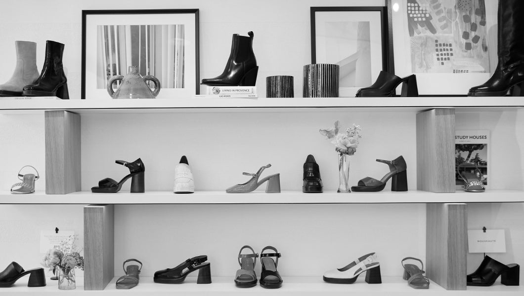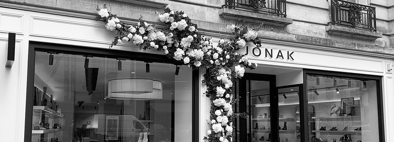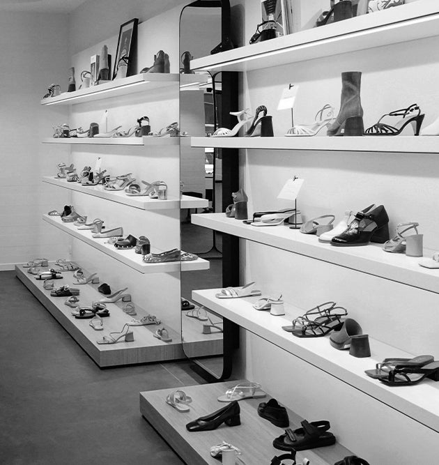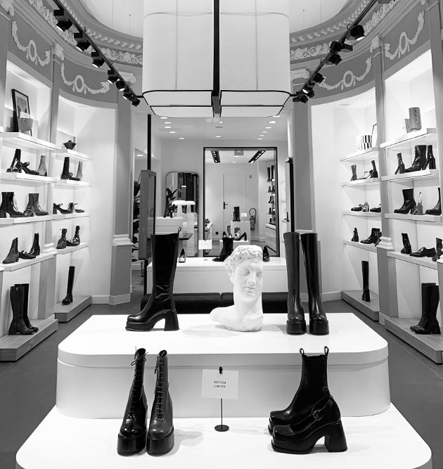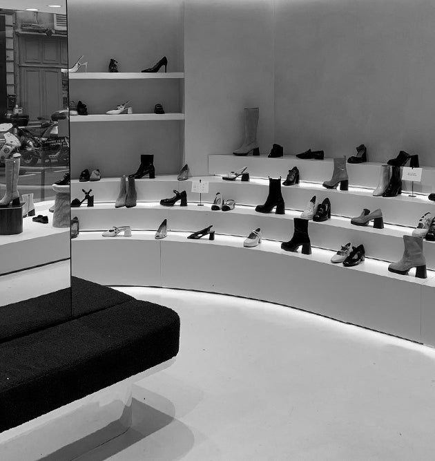 Both simple and sophisticated, crafted by French artisans in harmony with the brand's DNA. The materials used, such as oak wood, metal structures, and composite stone coatings, are carefully chosen to accentuate and magnify the shoes.